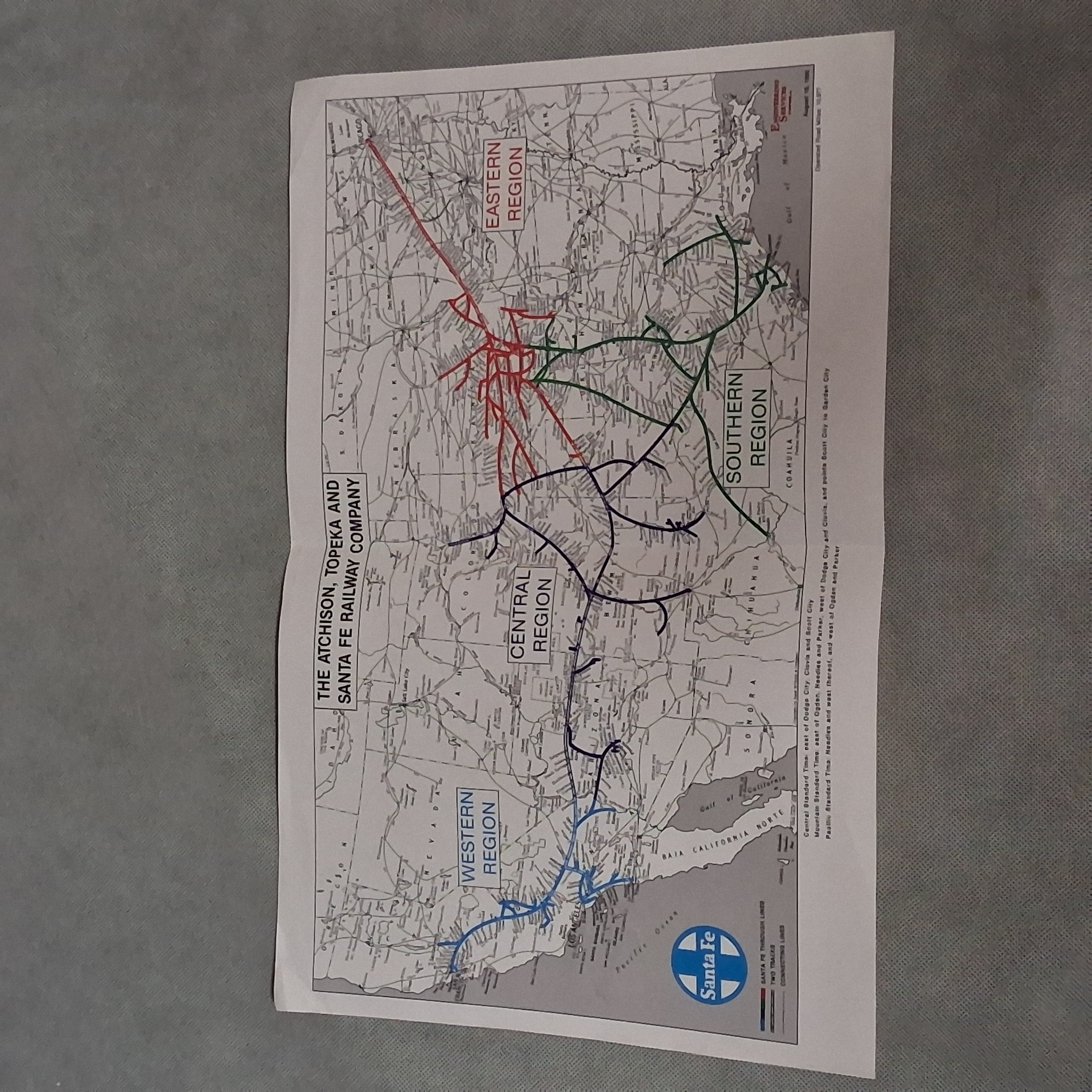 1990 Atchison Topeka and Santa Fe Railway United States Regions Map 17" x 11"