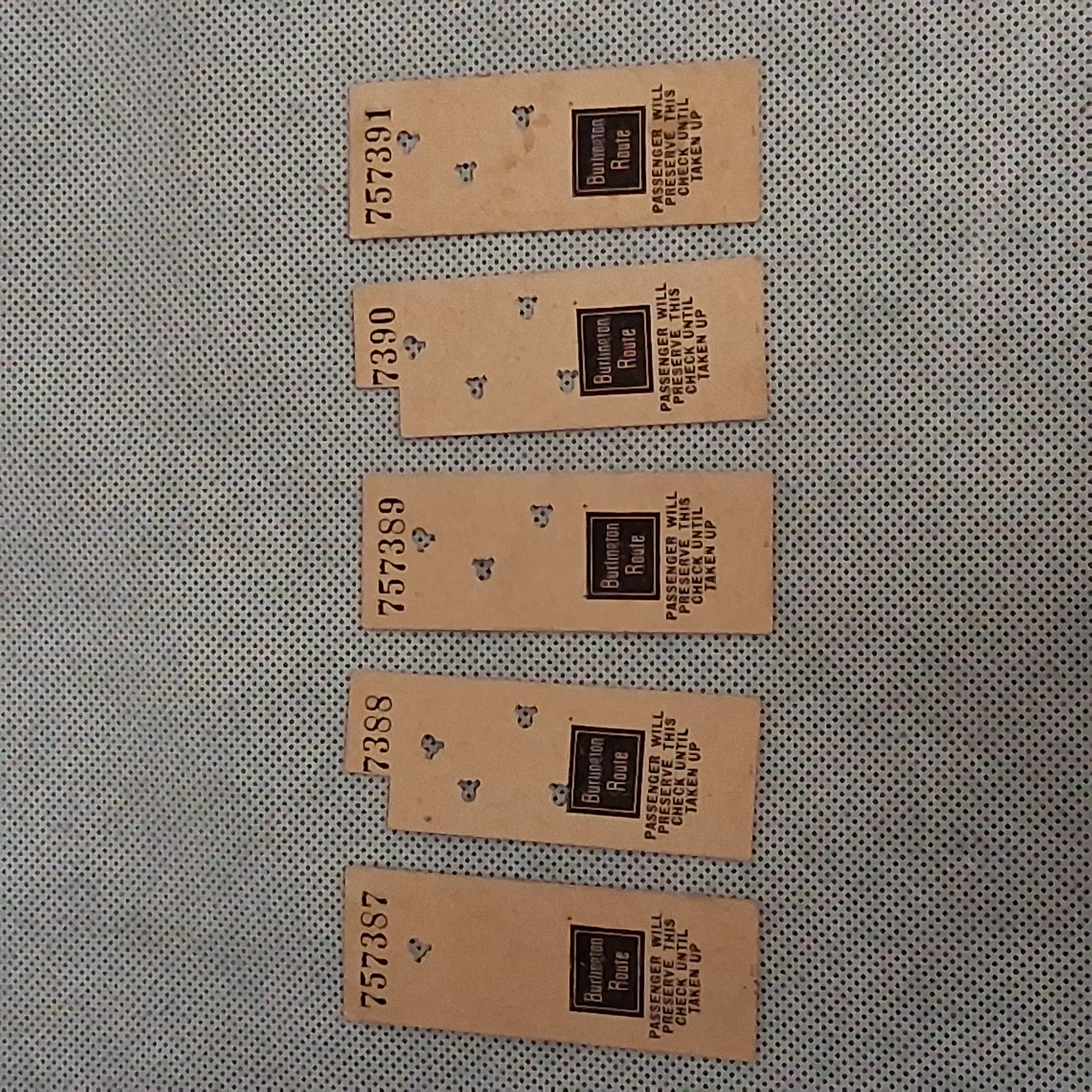 Burlington Route Ticket Check Stubs (5) 757387 757388 757389 757390 757391